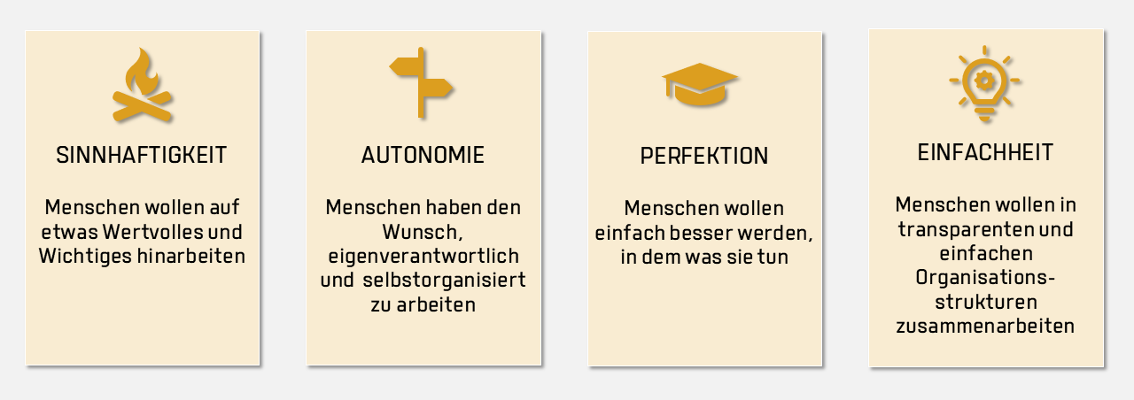 Wie erfüllt die neue Organisation nun die Bedürfnisse der Mitarbeiter nach Sinnhaftigkeit, Autonomie, Perfektion und Einfachheit?