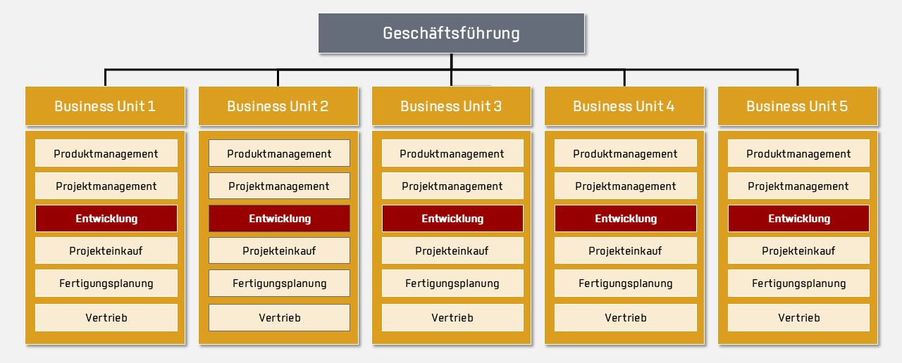 Diesen Bedürfnissen sollte die neue Organisation gerecht werden. Als primäres Strukturierungsmerkmal wurde das Projekt gewählt. Entwickler arbeiten nunmal fast ausnahmslos in Projekten. Die sich daraus ergebende Grundstruktur sieht eine flache Hierarchie mit Business Units und interdisziplinären Projektteams vor. Die Business Unit Manager haben so alle wichtigen Fachfunktionen für den Vertrieb, die Gestaltung der Produktstrategie sowie die Priorisierung und Durchführung interdisziplinärer Projekte einschließlich aller Entwickler an Board.