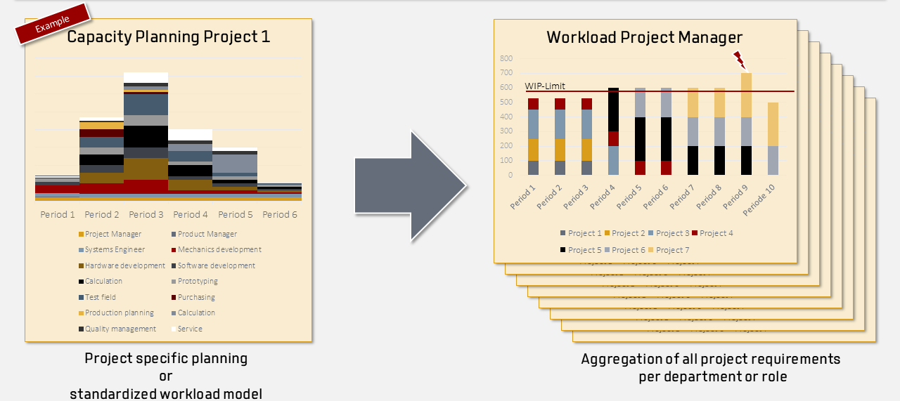 At the time of the project release decision, the future project plans created in the business units are aggregated in order of priority. As soon as the defined buffer of one of the 22 project resource categories is reached, the project cannot initially be released. Of course, increasing the capacity at the bottleneck point is a sensible reaction option.